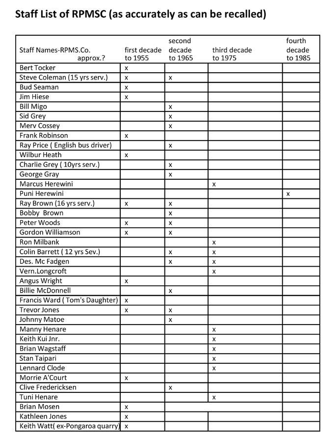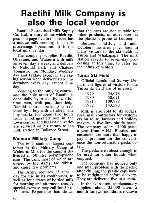Many people (some families still in the locality) can look back at some measure of service to or from or within the RPMSCo. Also the local tradesmen and essential services both willing and loyal who supported the needs of the Milk deliveries that had developed across the region from Raetihi Northward to National Park, Raurimu and at times Taumaranui, through to Hihitahi just north of Taihape (and at times, Taihape) including the ever expanding Waiouru Military camp, and the fast growing tourist Whakapapa and Turoa Ski fields that had developed.