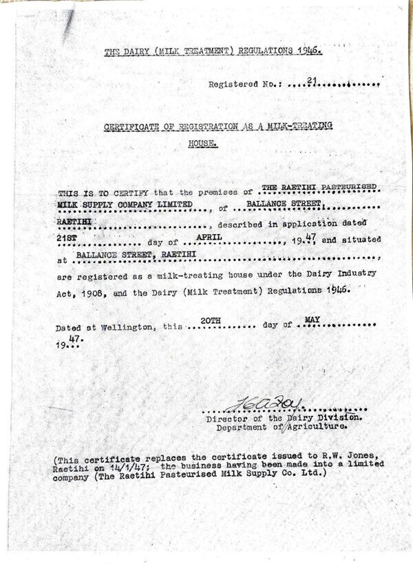 Immediately after Council approval was legally confirmed another new company was formed to subdivide and own more land, to own and oversee the construction of the new factory, procurement of new machinery and vehicles, processing of the milk and district wide distribution. This company was called- “The Raetihi Pasteurised Milk Supply Co. Ltd.” (RPMSCo), Ron Jones became the Manager and even more technical facilities and buildings were required.