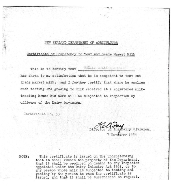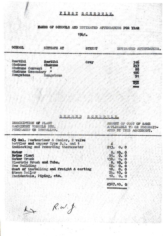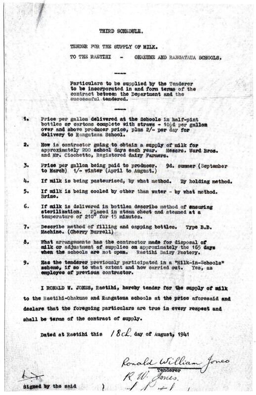 The three young men, Albert and Thomas Ward and Ron Jones, all of whom had growing families, faced many hurdles in 1938 such as bad roads, shortage of farm labour, petrol rationing, growing population and higher expectations, all pressing on their ability to continue this regional commitment for the next 7 years. Due to the high demands, they had little choice but to seriously rationalise their operations. Government’s Ministry of Agriculture restrictions were in play. Milk was becoming a serious commodity. Tenders from the Ministry and tenders were required from interested providers for school milk all around NZ. Every child at school was to be given a half pint of pasteurised milk at 10am school break. The Ward brothers’ milk delivery service had to face up to expansion. By 1941, Thomas Ward, Albert Ward, Ron Jones and Amy Jones had become partners and on 18th August 1941, Ron Jones as Manager signed a successful tender application for a contract to supply pasteurised milk to all the local schools. This resulted in increased sales demand over the whole district and required some more serious rationalisation.