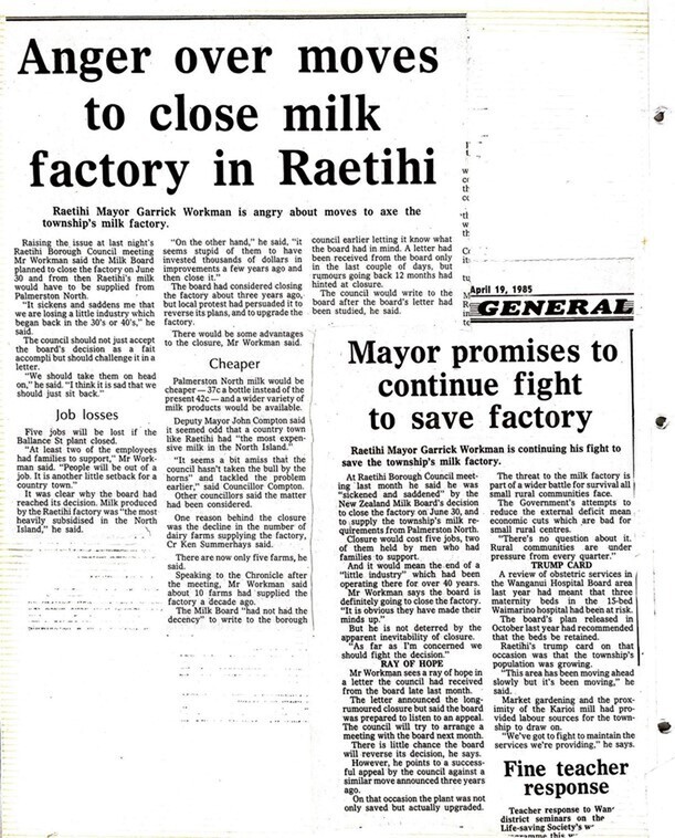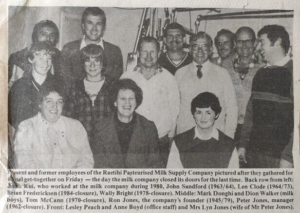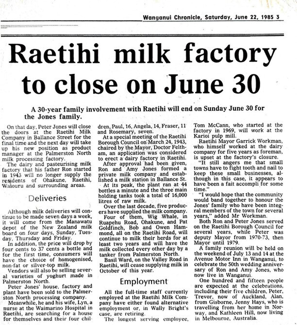See Appendix: “RAETIHI MILK COMPANY IS ALSO THE LOCAL VENDOR”.Unfortunately, de-regulation of the National Milk Industry meant removal of the subsidies from all the Milk Station's and a bidding-process began to occur between other closely located factories. Raetihi was the smallest in the North Island and with the sale of the Vending Distribution side that supported the Processing side, the final bidding focused around protecting the Supplier's milking herds which had been a promise made to Suppliers Association in the 1943 meeting. However this was seriously uncompetitive. Other factories and bigger changes forced RPMSCo out.On Friday June 28th 1985:The factory machines ceased running and the premises became storage for distribution from thereon.See Appendix: “ANGER OVER MOVES TO CLOSE MILK FACTORY” and “RAETIHI MILK FACTORY TO CLOSE ON JUNE 30”.Milk of course had moved on from Billies to Bottles to Cartons to Plastics to Bags and everything in-between and beyond.
