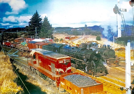 At Ohakune Junction showing the Raetihi Branch leading off to the right with a train headed by an Ab steam locomotive. On the other two busy rails is a Ka steam loco and a Da diesel loco hauling freight consignments.
