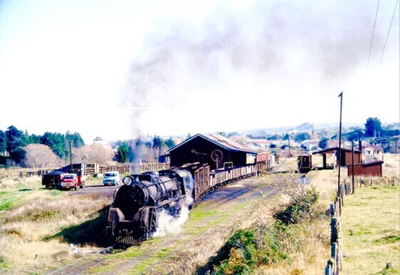 Oil-fired Jb 1203 steam locomotive heads a consist of empty wagons from beneath the Raetihi goods shed veranda. At left is Trev. McCoy's Bedford J series truck ready to be loaded with bagged coal from an La wagon. Note the extensive stockyards behind and the one and a half ton whippet yard crane beside the goods shed.