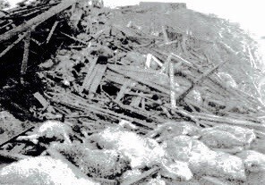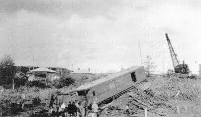 The only major accident on the branch line was on February 15 1930 when 15 runaway loaded sheep wagons and guard's van crashed through the stop block at the end of the Raetihi station yard in the early hours. Hundreds of sheep were killed as the wagons were concertinaed behind the van. Above: A steam crane helping to recover the van with a group of folk looking on.