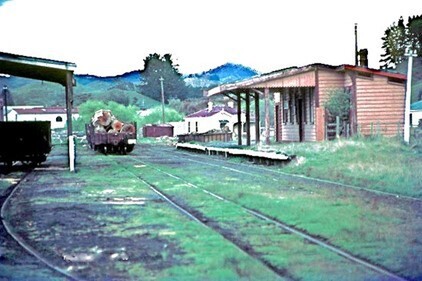 Looking along the Raetihi yard with a wagon of logs at centre awaiting despatch. Note at right the station building with a NZR house behind.