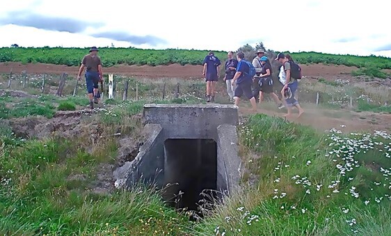 Some of a Rusty Rails group of rail enthusiasts walking over a concrete culvert on the former Branch line.